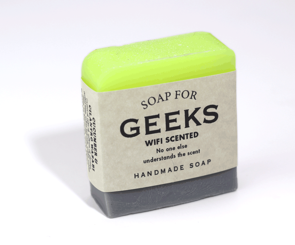 Geeks may be immune to sarcasm, but they’re not immune to dirt. At least we don’t *think* so. There is a guy in our IT department who says we’re all just a computer simulation so what difference does it make? Don’t ask. He’ll go on for hours and you won’t understand a word. He’ll be the first recipient of our Soap for Geeks, btw. It’s scented with a cucumber, cilantro and wasabi fragrance that is difficult to place, and what we imagine wifi would smell like if it could. So come on, wash up. We know you’ll dig this handmade soap. It’s like, all sciencey and stuff.